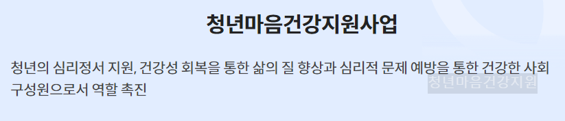 청년 마음 건강 지원 사업은 전문적인 심리 상담을 통해 청년들이 심리적 안정을 찾고, 심리적인 문제를 예방하며 건강한 삶을 살아갈 수 있도록 돕는 프로그램입니다.
